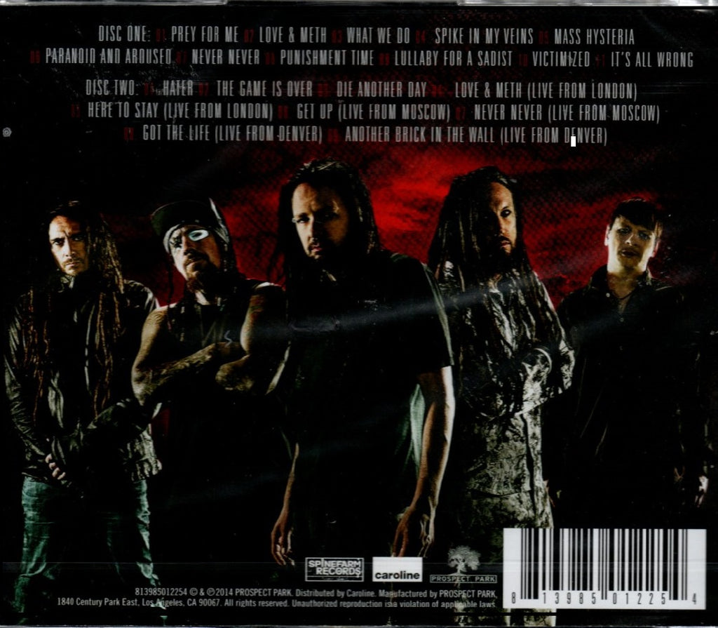 Disc One 1 Prey For Me 2 Love & Meth 3 What We Do 4 Spike In My Veins 5 Mass Hysteria 6 Paranoid And Aroused 7 Never Never 8 Punishment Time 9 Lullaby For A Sadist 10 Victimized 11 It's All Wrong Disc Two 1 Hater 2 The Game Is Over 3 Die Another Day 4 Love & Meth (Live From London) 5 Here To Stay (Live From London) 6 Get Up (Live From Moscow) 7 Never Never (Live From Moscow) 8 Got The Life (Live From Denver) 9 Another Brick In The Wall (Live From Denver)
