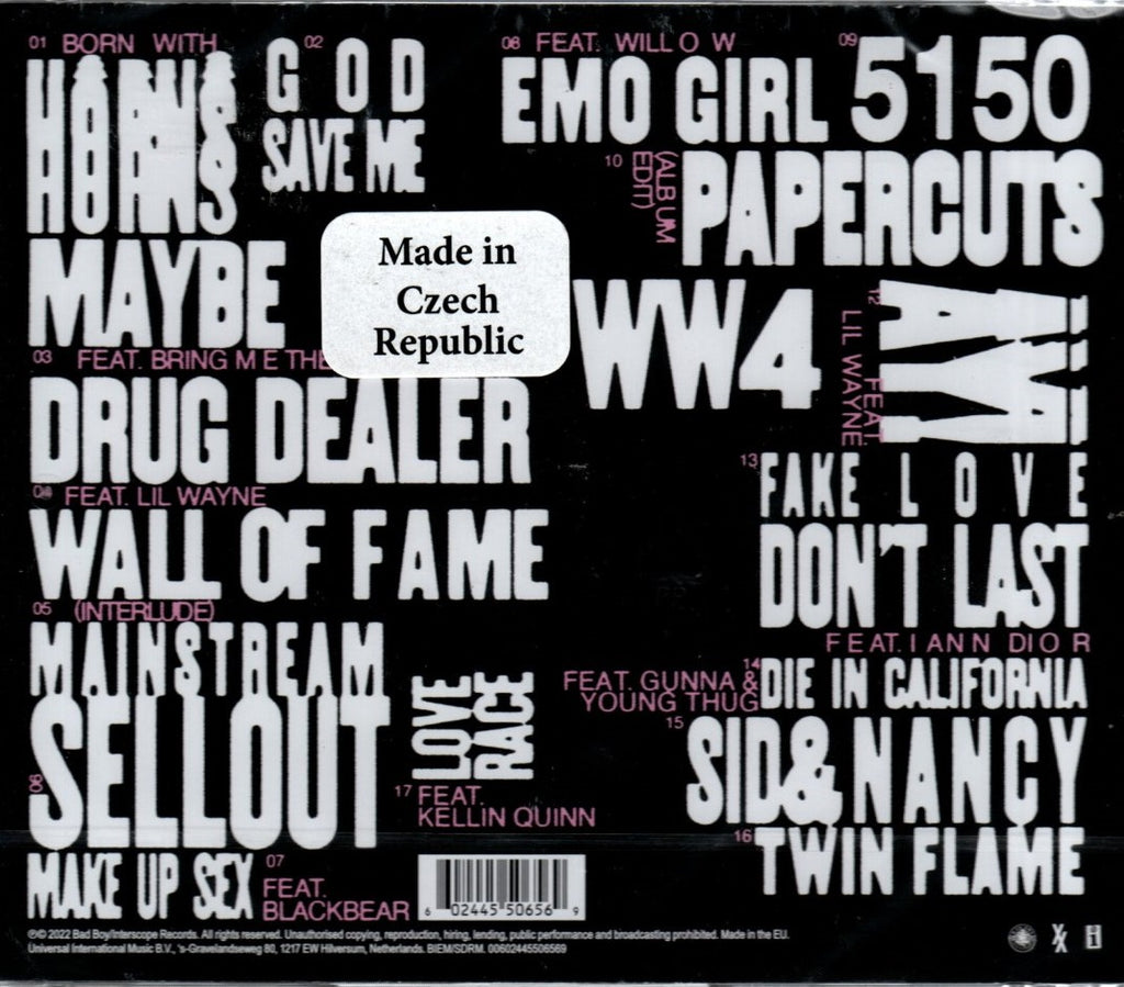 1 Born With Horns 2 God Save Me 3 Maybe 4 Drug Dealer 5 Wall of Fame (Interlude) 6 Mainstream Sellout 7 Make Up Sex 8 Emo Girl 9 5150 10 Papercuts (Album Edit) 11 WW4 12 Ay! 13 Fake Love Don't Last 14 Die In California 15 Sid & Nancy 16 Twin Flame 17 Love Race (feat Kellin Quinn) bonus track