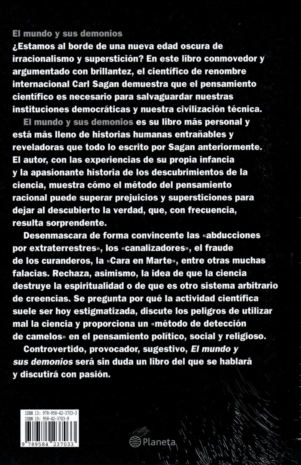 ¿Estamos al borde de una nueva edad oscura de irracionalismo y superstición? En este libro conmovedor el incomparable Carl Sagan demuestra con brillantez que el pensamiento científico es necesario para salvaguardar nuestras instituciones democráticas y nuestra civilización técnica. El mundo y sus demonios es el libro más personal de Sagan, y está lleno de historias humanas entrañables y reveladoras. El autor, con las experiencias de su propia infancia y la apasionante historia de los descubrimientos de la ciencia, muestra cómo el método del pensamiento racional puede superar prejuicios y supersticiones para dejar al descubierto la verdad, que, con frecuencia, resulta sorprendente.