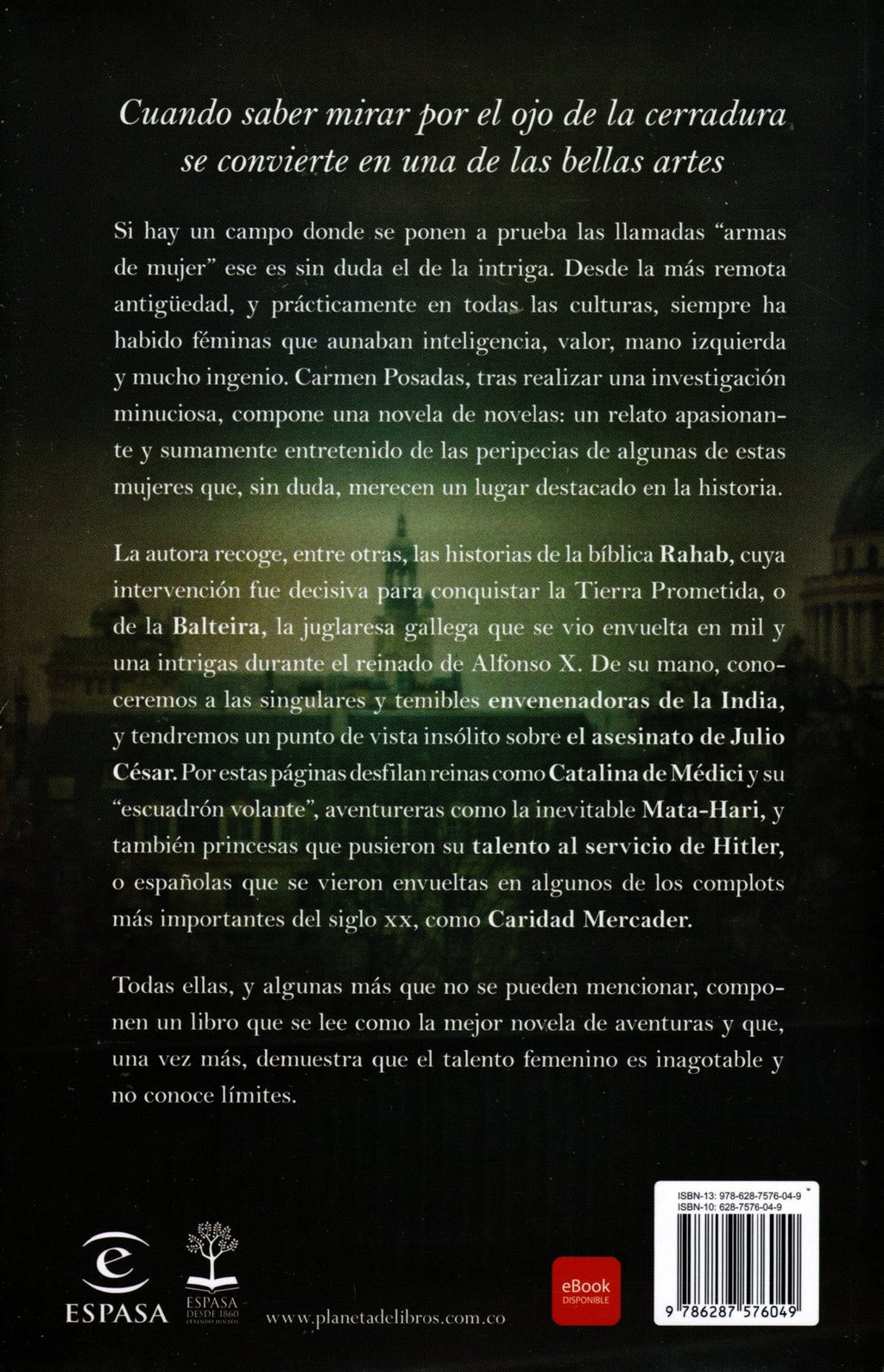 Si hay un campo donde se ponen a prueba las llamadas “armas de mujer” ese es sin duda el de la intriga. Desde la más remota antigüedad, y prácticamente en todas las culturas, siempre ha habido féminas que aunaban inteligencia, valor, mano izquierda y mucho ingenio. Carmen Posadas, tras realizar una investigación minuciosa, compone un relato apasionante y sumamente entretenido de las peripecias de algunas de estas mujeres que, sin duda, merecen un lugar destacado en la historia.