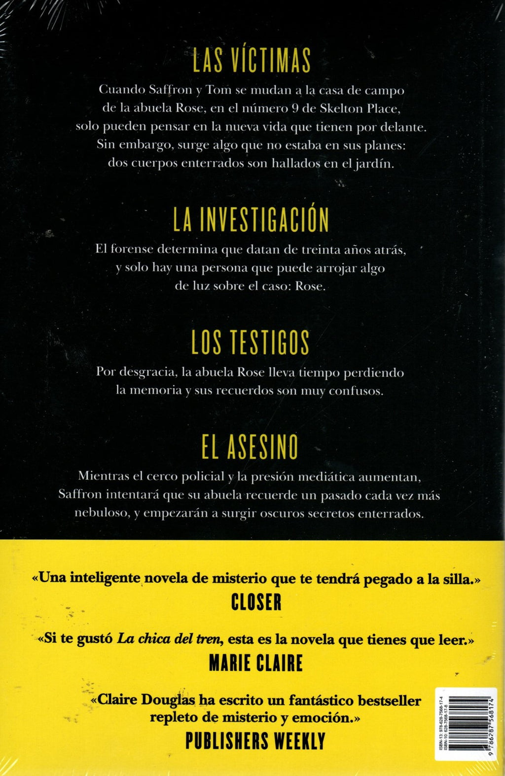 LAS VÍCTIMAS. Cuando Saffron y Tom se mudan a la casa de campo de la abuela Rose, en el número 9 de Skelton Place, solo pueden pensar en la nueva vida que tienen por delante. Sin embargo, algo surge que no estaba en sus planes: dos cuerpos enterrados son hallados en su jardín. LA INVESTIGACIÓN. El forense determina que datan de treinta años atrás y sólo hay una persona que puede arrojar algo de luz sobre el caso: Rose. LOS TESTIGOS. Por desgracia, la abuela Rose lleva tiempo perdiendo la memoria y sus recuerdos son muy confusos. EL ASESINO. A partir de ese momento y con la prensa encima, Saffron intentará que su abuela recuerde un pasado cada vez más nebuloso, mientras empiezan a salir a la luz oscuros secretos del pasado.