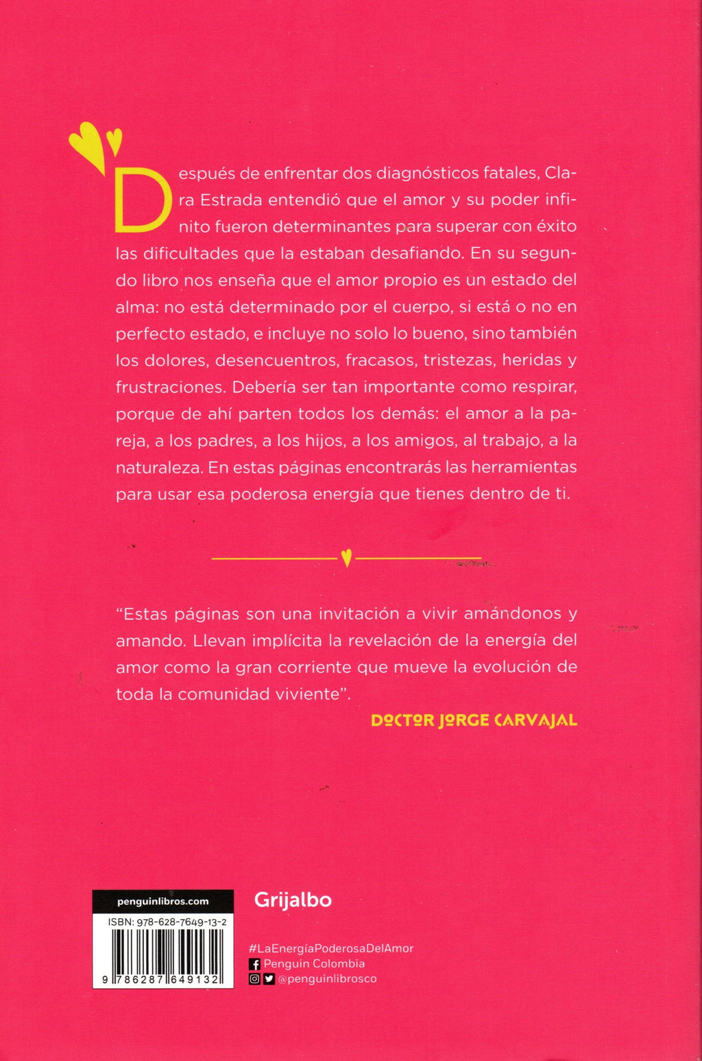 Después de enfrentar dos diagnósticos fatales, Clara Estrada entendió que el amor y su poder infinito fueron determinantes para superar con éxito las dificultades que la estaban desafiando. En su segundo libro nos enseña que el amor propio es un estado del alma: no está determinado por el cuerpo, si está o no en perfecto estado, e incluye no solo lo bueno, sino también los dolores, desencuentros, fracasos, tristezas, heridas y frustraciones. Debería ser tan importante como respirar, porque de ahí parten todos los demás: el amor a la pareja, a los padres, a los hijos, a los amigos, al trabajo, a la naturaleza. En estas páginas encontrarás las herramientas para usar esa poderosa energía que tienes dentro de ti.