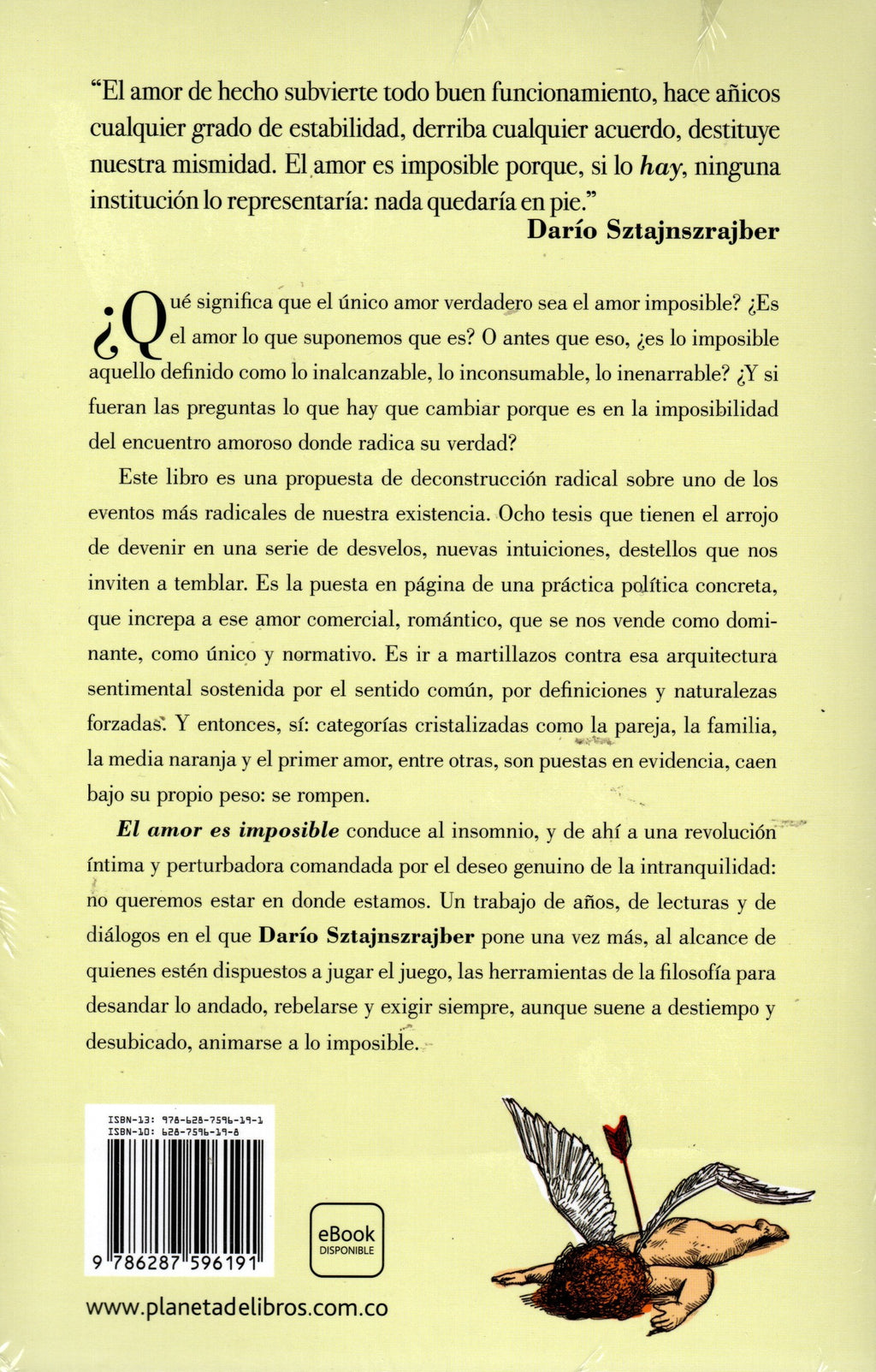 ¿Qué significa que el único amor verdadero sea el amor imposible? ¿Es el amor lo que suponemos que es? O antes que eso, ¿es lo imposible aquello definido como lo inalcanzable, lo inconsumable, lo inenarrable? ¿Y si fueran las preguntas lo que hay que cambiar porque es en la imposibilidad del encuentro amoroso donde radica su verdad? Este libro es una propuesta de deconstrucción radical sobre uno de los eventos más radicales de nuestra existencia. Ocho tesis que tienen el arrojo de devenir en una serie de desvelos, nuevas intuiciones, destellos que nos inviten a temblar. Es la puesta en página de una práctica política concreta, que increpa a ese amor comercial, romántico, que se nos vende como domi-nante, como único y normativo. Es ir a martillazos contra esa arquitectura sentimental sostenida por el sentido común, por definiciones y naturalezas forzadas. Y entonces, sí: categorías cristalizadas como la pareja, la familia, la media naranja y el primer amor, entre otras, son puestas en evidencia, caen bajo su propio peso: se rompen. El amor es imposible conduce al insomnio, y de ahí a una revolución íntima y perturbadora comandada por el deseo genuino de la intranquilidad: no queremos estar en donde estamos. Un trabajo de años, de lecturas y de diálogos en el que Darío Sztajnszrajber pone una vez más, al alcance de quienes estén dispuestos a jugar el juego, las herramientas de la filosofía para desandar lo andado, rebelarse y exigir siempre, aunque suene a destiempo y desubicado, animarse a lo imposible.