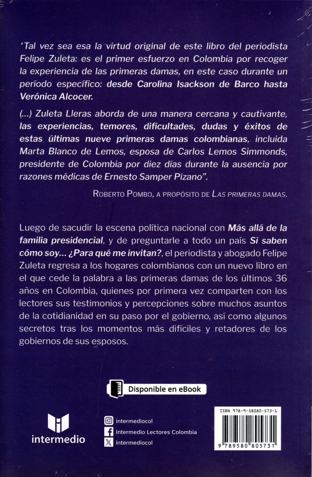 Luego de sacudir la escena política nacional con “Más allá de la familia presidencial”, y de preguntarle a todo un país “Si saben cómo soy… ¿Para qué me invitan?”, el periodista y abogado Felipe Zuleta regresa a los hogares colombianos con un nuevo libro en el que cede la palabra a las primeras damas de los últimos 36 años en Colombia, quienes por primera vez comparten con los lectores sus testimonios y percepciones sobre muchos asuntos de la cotidianidad en su paso por el gobierno.