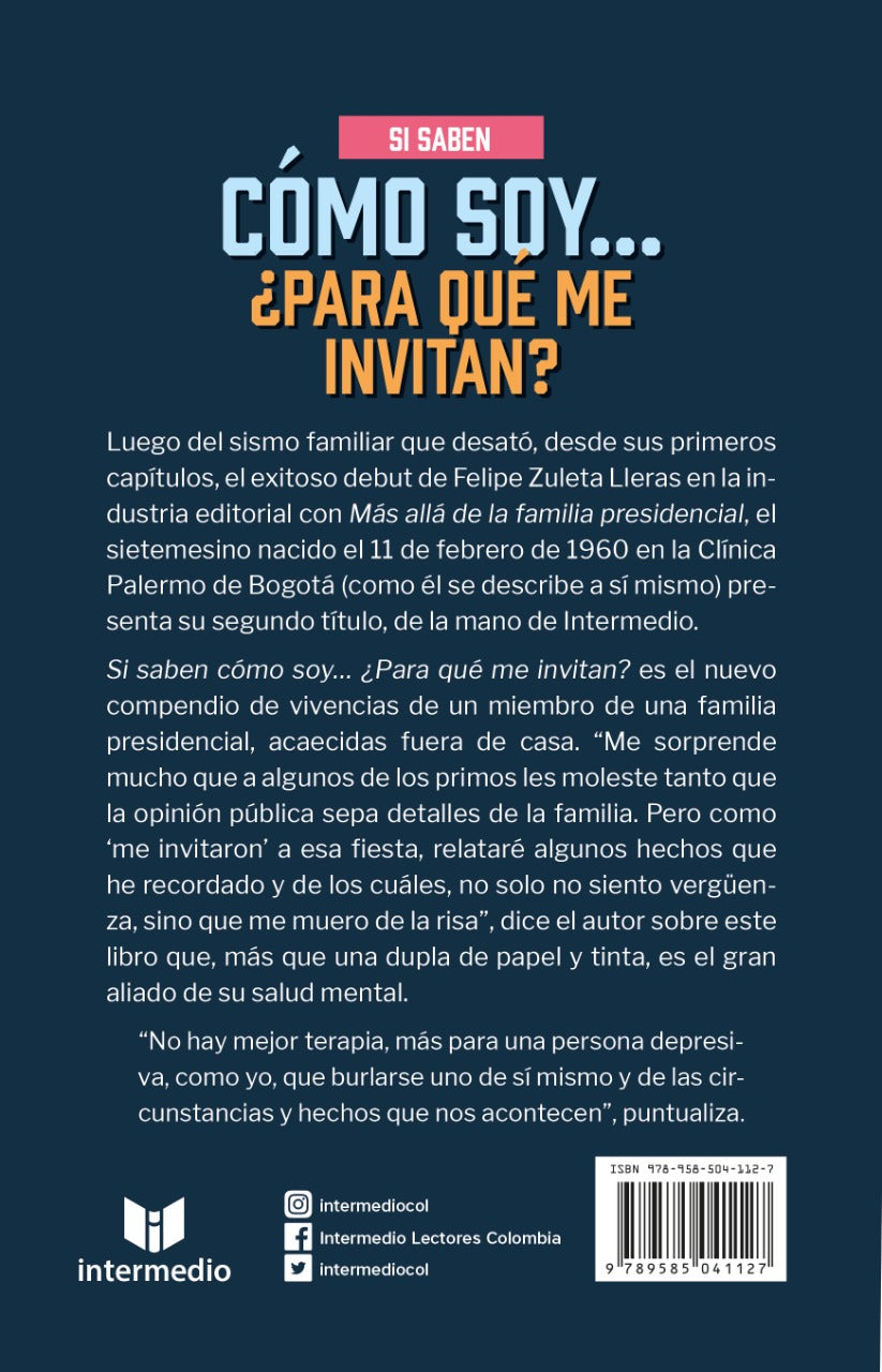 Después del exitoso debut de Felipe Zuleta Lleras en la industria editorial con Más allá de la familia presidencial, presenta su segundo título, de la mano de Intermedio. Si saben cómo soy… ¿Para qué me invitan? es el nuevo compendio de vivencias de un miembro de una familia presidencial, este libro más que una dupla de papel y tinta, es el gran aliado de la salud mental del autor.