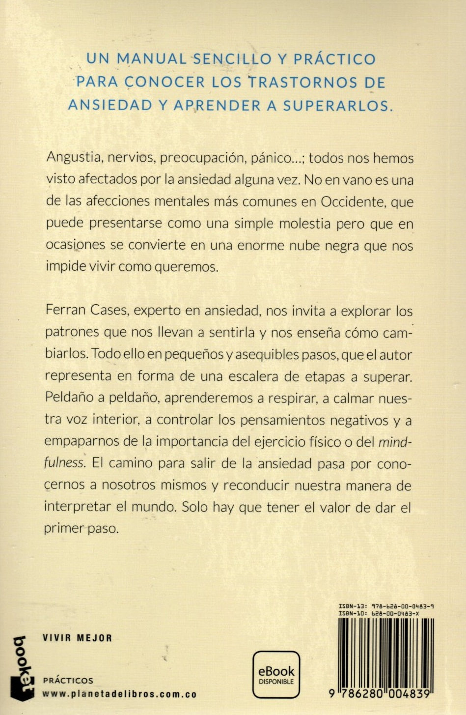 Ferran Cases, experto en ansiedad, nos invita a explorar los patrones que nos llevan a sentir ansiedad y nos enseña cómo cambiarlos. Todo ello en pequeños y asequibles pasos, que el autor representa en forma de una escalera de etapas a superar. Peldaño a peldaño, aprenderemos a respirar, a calmar nuestra voz interior y controlar los pensamientos catastróficos, a empaparnos de la importancia del ejercicio físico o del mindfulness, a cultivar hábitos que nos permitan seguir avanzando… El camino para salir de la ansiedad pasa por conocernos a nosotros mismos y reconducir nuestra manera de interpretar el mundo, y solo hay que tener el valor de dar el primer paso.