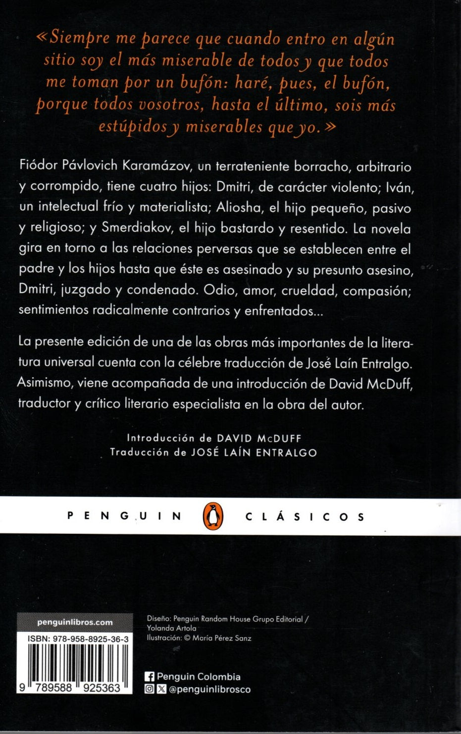 Fiódor Pávlovich Karamázov, un terrateniente borracho, arbitrario y corrompido, tiene cuatro hijos: Dmitri, de carácter violento; Iván, un intelectual frío y materialista; Aliosha, el hijo pequeño, pasivo y religioso; y Smerdiakov, el hijo bastardo y resentido. La novela gira en torno a las relaciones perversas que se establecen entre el padre y los hijos hasta que éste es asesinado y su presunto asesino, Dmitri, juzgado y condenado. Odio, amor, crueldad, compasión, sentimientos radicalmente contrarios y enfrentados...