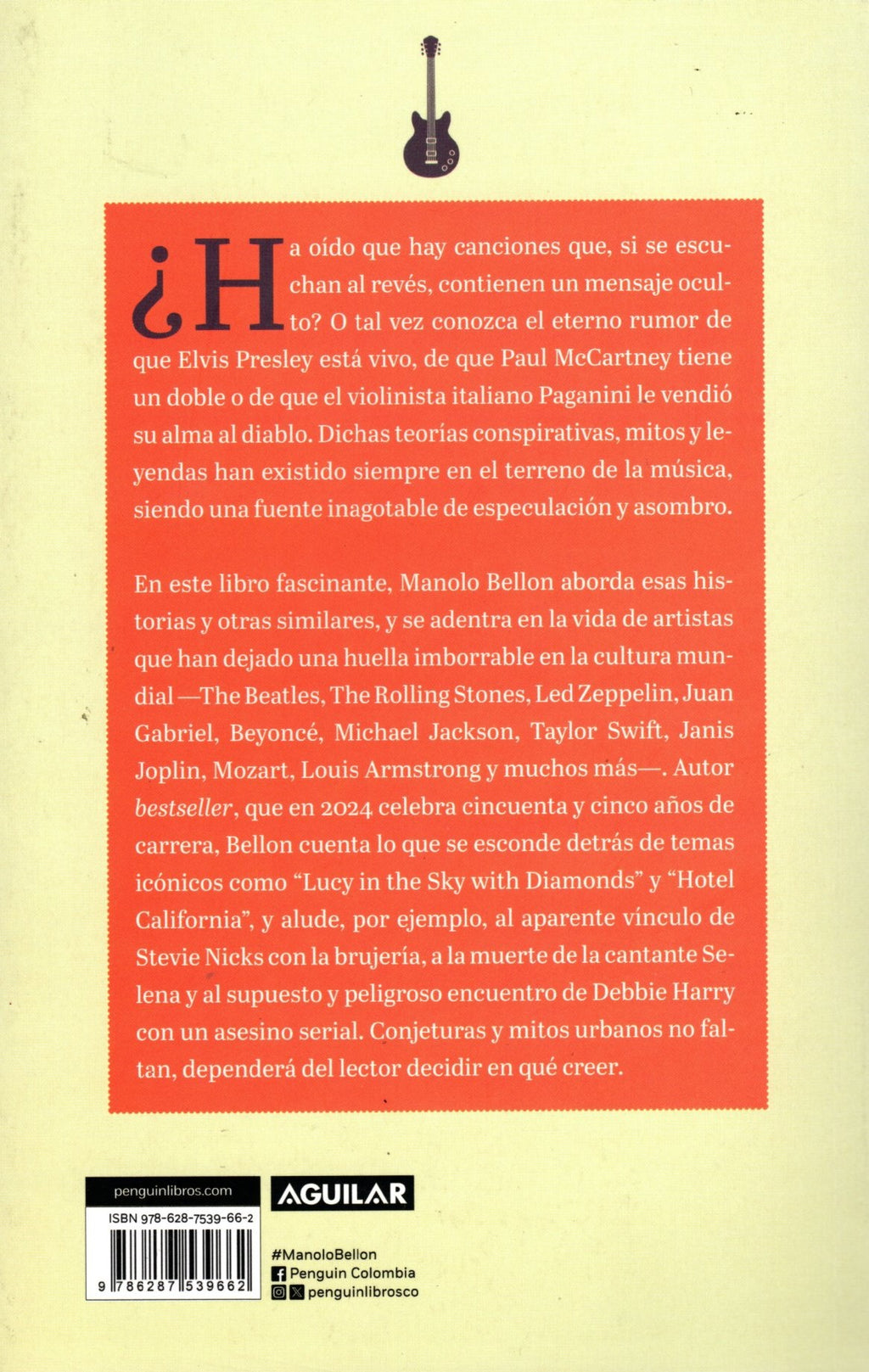 En este libro fascinante, Manolo Bellon aborda esas historias y otras similares, y se adentra en la vida de artistas que han dejado una huella imborrable en la cultura mundial -The Beatles, The Rolling Stones, Led Zeppelin, Juan Gabriel, Beyoncé, Michael Jackson, Taylor Swift, Janis Joplin, Mozart, Louis Armstrong y muchos más-. Autor bestseller, que en 2024 celebra cincuenta y cinco años de carrera, Bellon cuenta lo que se esconde detrás de temas icónicos como "Lucy in the Sky with Diamonds" y "Hotel California", y alude, por ejemplo, al aparente vínculo de Stevie Nicks con la brujería, a la muerte de la cantante Se lena y al supuesto y peligroso encuentro de Debbie Harry con un asesino serial. Conjeturas y mitos urbanos no faltan, dependerá del lector decidir en qué creer.