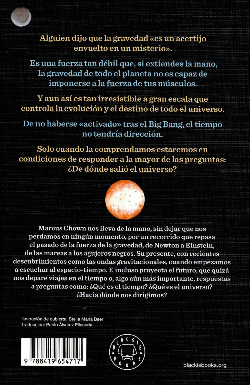 Marcus Chown nos lleva de la mano, sin dejar que nos perdamos en ningún momento, por un recorrido que repasa el pasado de la fuerza de la gravedad, de Newton a Einstein, de las mareas a los agujeros negros. Su presente, con recientes descubrimientos como las ondas gravitacionales, cuando empezamos a escuchar al espacio-tiempo. E incluso proyecta el futuro, que quizá nos depare viajes en el tiempo o, algo aún más importante, respuestas a preguntas como: ¿Qué es el tiempo? ¿Qué es el universo? ¿Hacia dónde nos dirigimos?