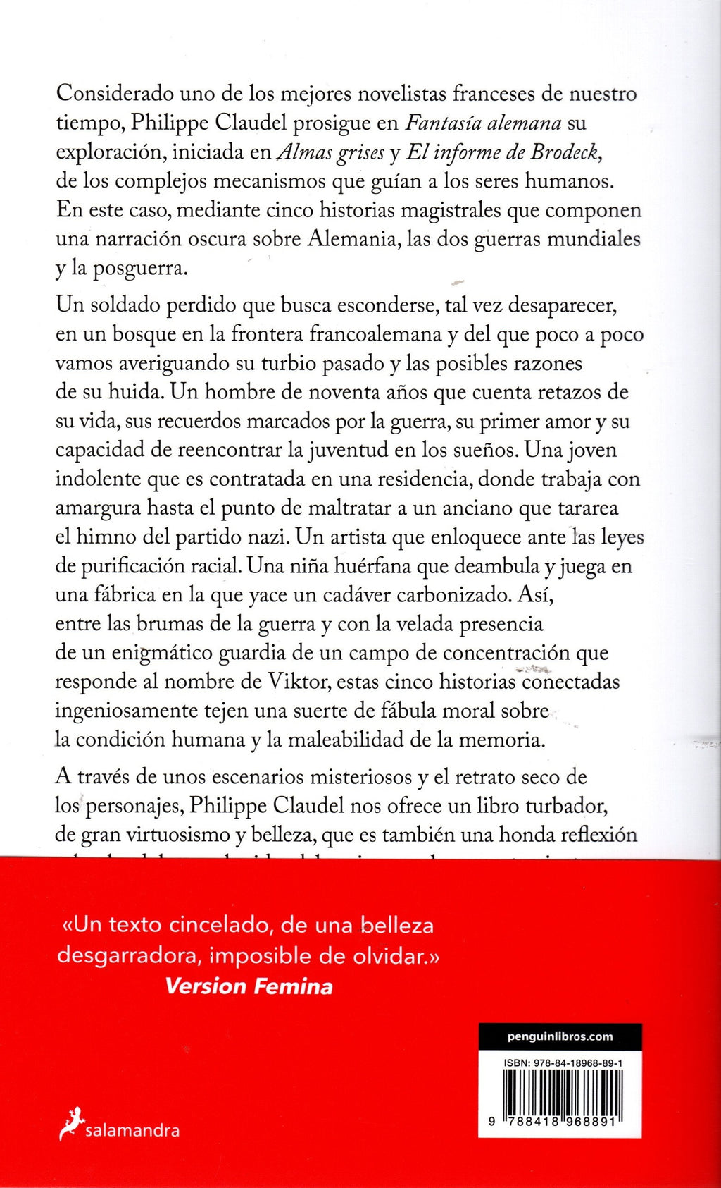 Considerado uno de los mejores novelistas franceses de su generación, Philippe Claudel prosigue en Fantasía alemana la indagación de los recodos más sombríos y los complejos mecanismos que guían a los seres humanos iniciada en Almas grises y El informe de Brodeck. En este caso, a través de cinco relatos relacionados entre sí que componen una narración personal, oscura y descarnada, sobre Alemania, las dos guerras mundiales y la posguerra.