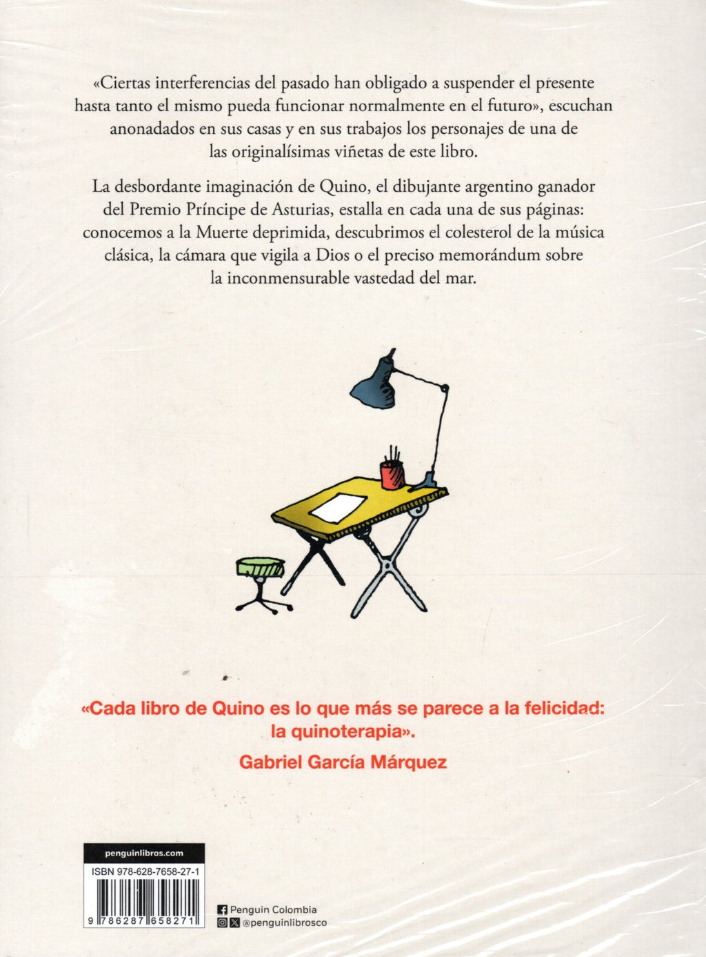 La desbordante imaginación de Quino, el dibujante argentino ganador del Premio Príncipe de Asturias, estalla en cada una de sus páginas: conocemos a la Muerte deprimida, descubrimos el colesterol de la música clásica, la cámara que vigila a Dios o el preciso memorándum sobre la inconmensurable vastedad del mar.