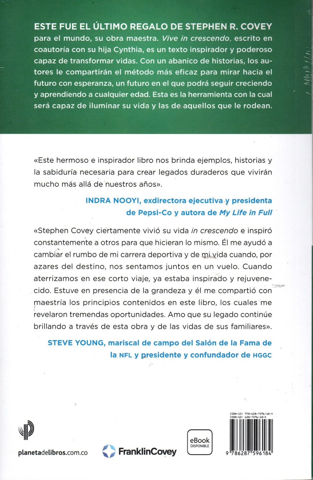 Este es el último regalo de Stephen R. Covey para el mundo, su obra maestra. Vive in crescendo, escrito en coautoría con su hija Cynthia, es un texto inspirador y poderoso capaz de transformar vidas. Con un abanico de historias, los autores le compartirán el método más eficaz para mirar hacia el futuro con esperanza, un futuro en el que podrá seguir creciendo y aprendiendo a cualquier edad. Esta es la herramienta con la cual será capaz de iluminar su vida y las de aquellos que le rodean.
