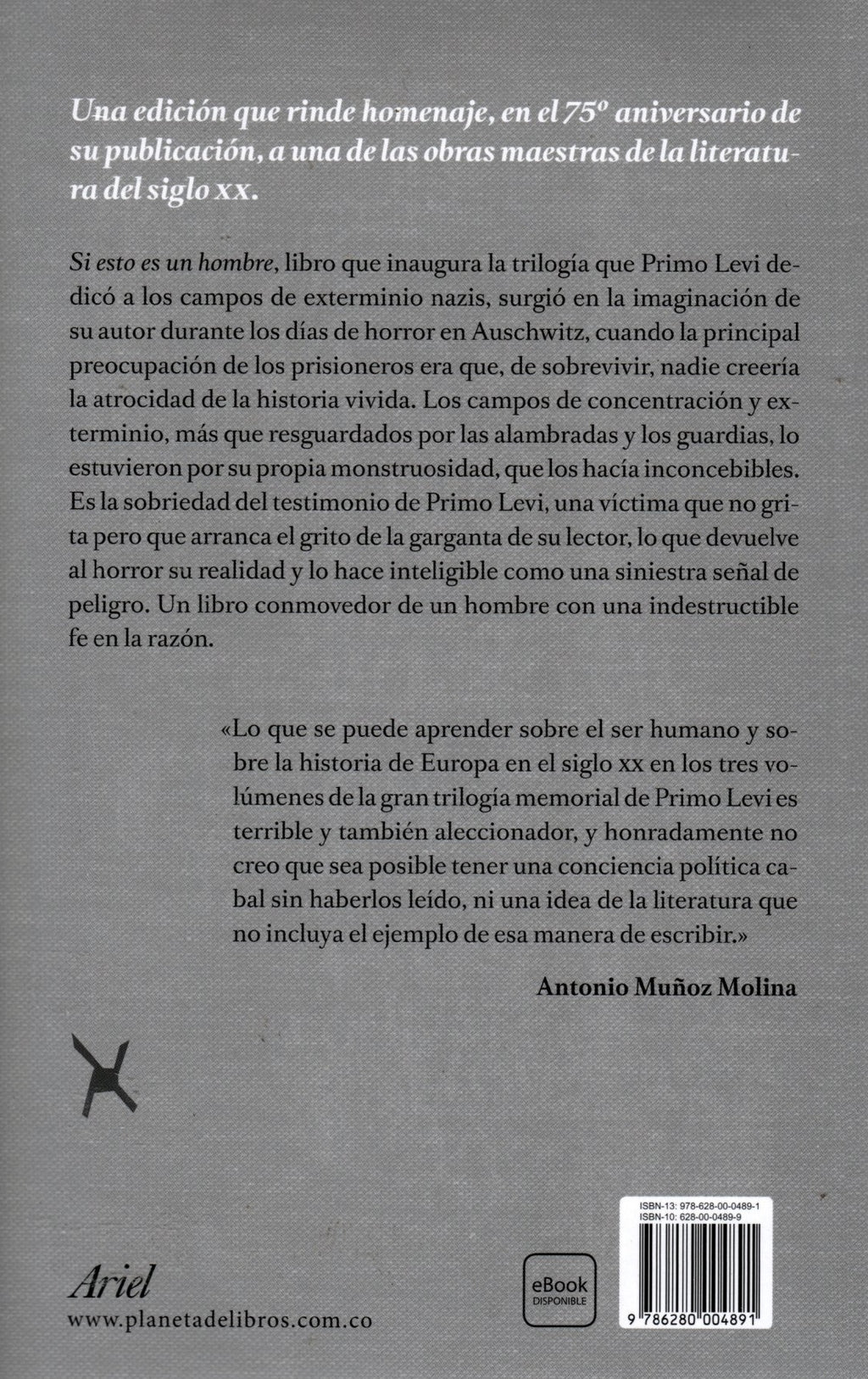 Si esto es un hombre, libro que inaugura la trilogía que Primo Levi dedicó a los campos de exterminio nazis, surgió en la imaginación de su autor durante los días de horror en Auschwitz, cuando la principal preocupación de los prisioneros era que, de sobrevivir, nadie creería la atrocidad de la historia vivida. Los campos de concentración y exterminio, más que resguardados por las alambradas y los guardias, lo estuvieron por su propia monstruosidad, que los hacía inconcebibles. Es la sobriedad del testimonio de Primo Levi, una víctima que no grita pero que arranca el grito de la garganta de su lector, lo que devuelve al horror su realidad y lo hace inteligible como una siniestra señal de peligro. Un libro conmovedor de un hombre con una indestructible fe en la razón.