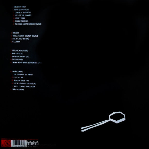 Lado A 1 American Idiot 2 Jesus Of Suburbia [ I. Jesus Of Suburbia - II. City Of The Damned - III. I Don't Care - IV. Dearly Beloved - V. Tales Of Another Broken Home] Lado B 1 Holiday 2 Boulevard Of Broken Dreams 3 Are We The Waiting 4 St. Jimmy Lado C 1 Give Me Novacaine 2 She's A Rebel 2:00 3 Extraordinary Girl 4 Letterbomb 5 Wake Me Up When September Ends Lado D 1 Homecoming: [I. The Death Of St. Jimmy - II. East 12th St. - III. Nobody Likes You - IV. Rock And Roll Girlfriend - V. We're Coming Home Again] 2 Whatsername