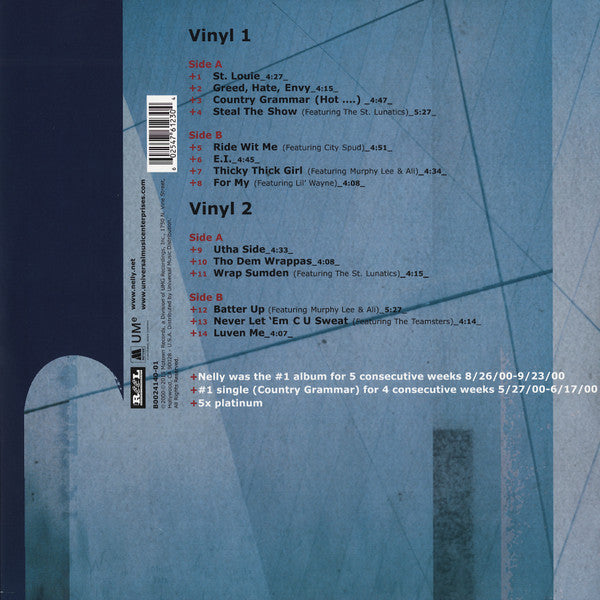 LP1 Lado A 1 St. Louie 2 Greed, Hate, Envy 3 Country Grammar (Hot ....) 4 Steal The Show Lado B 1 Ride Wit Me 2 E.I. 3 Thicky Thick Girl 4 For My LP Lado A 1 Utha Side 2 Tho Dem Wrappas 3 Wrap Sumden Lado B 1 Batter Up 2 Never Let 'Em C U Sweat 3 Luven Me
