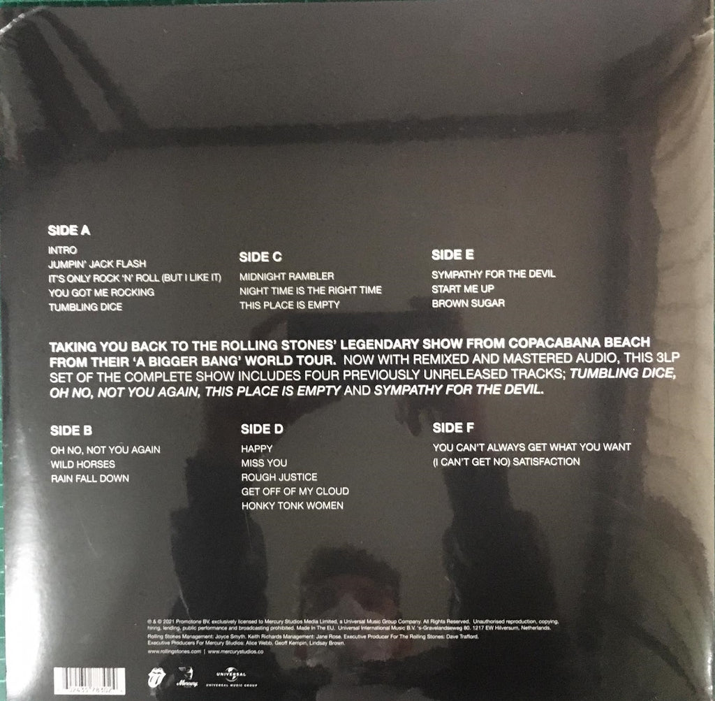 A1 Intro A2 Jumpin' Jack Flash A3 It's Only Rock 'N' Roll (But I Like It) A4 You Got Me Rocking A5 Tumbling Dice B1 Oh No, Not You Again B2 Wild Horses B3 Rain Fall Down C1 Midnight Rambler C2 Night Time Is The Right Time C3 This Place Is Empty D1 Happy D2 Miss You D3 Rough Justice D4 Get Off Of My Cloud D5 Honky Tonk Women E1 Sympathy For The Devil E2 Start Me Up E3 Brown Sugar F1 You Can't Always Get What You Want F2 (I Can't Get No) Satisfaction